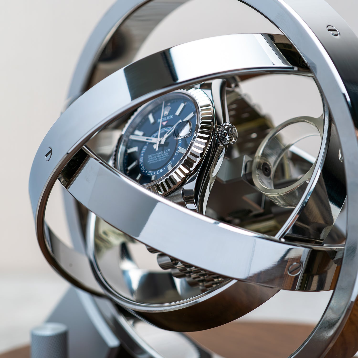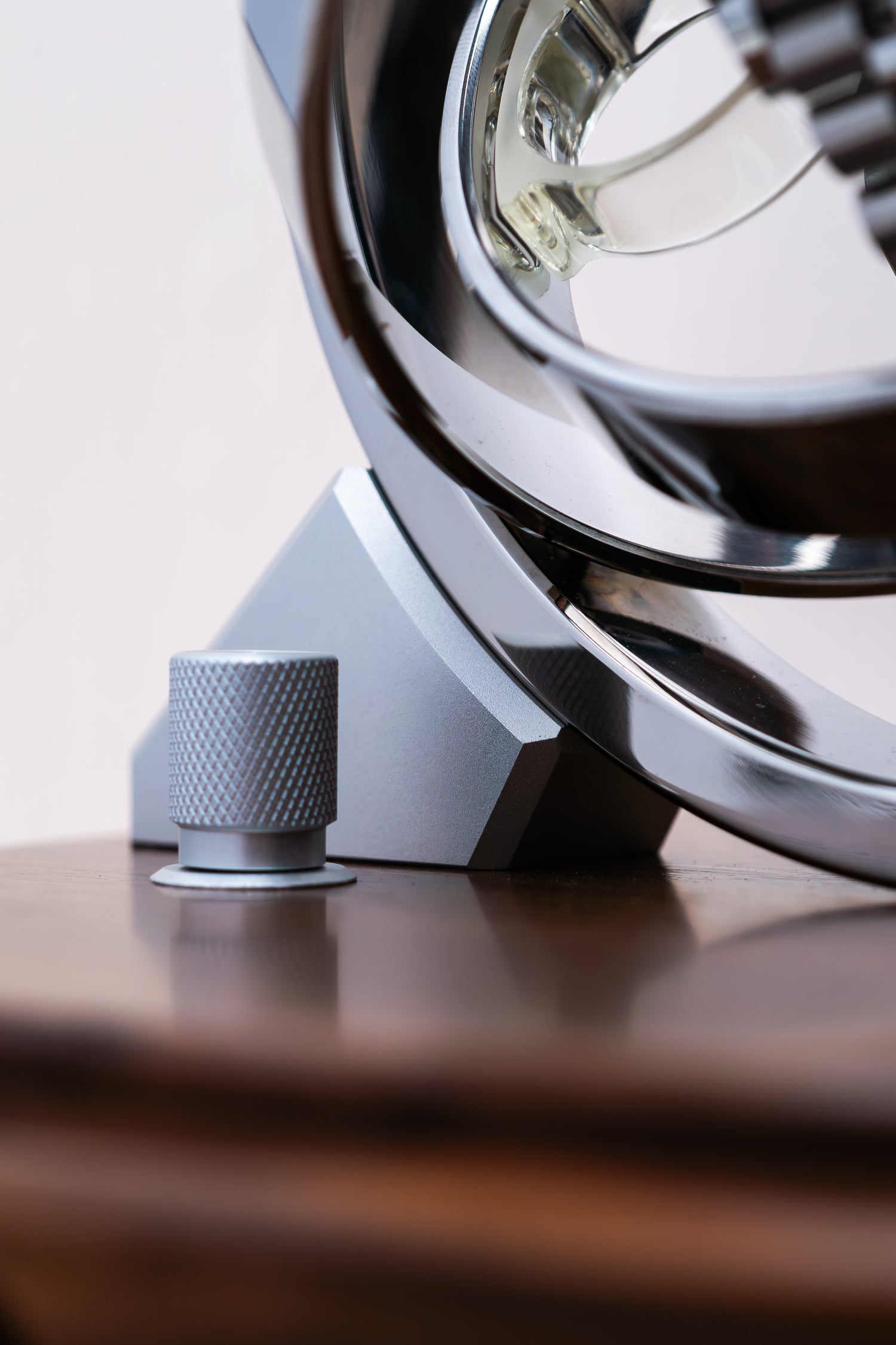 Encased in polished stainless steel and crowned with a hand-blown glass dome, the Orbit Winder is as visually striking as it is technically advanced. Its precise mechanics ensure seamless operation, while its refined construction guarantees longevity.