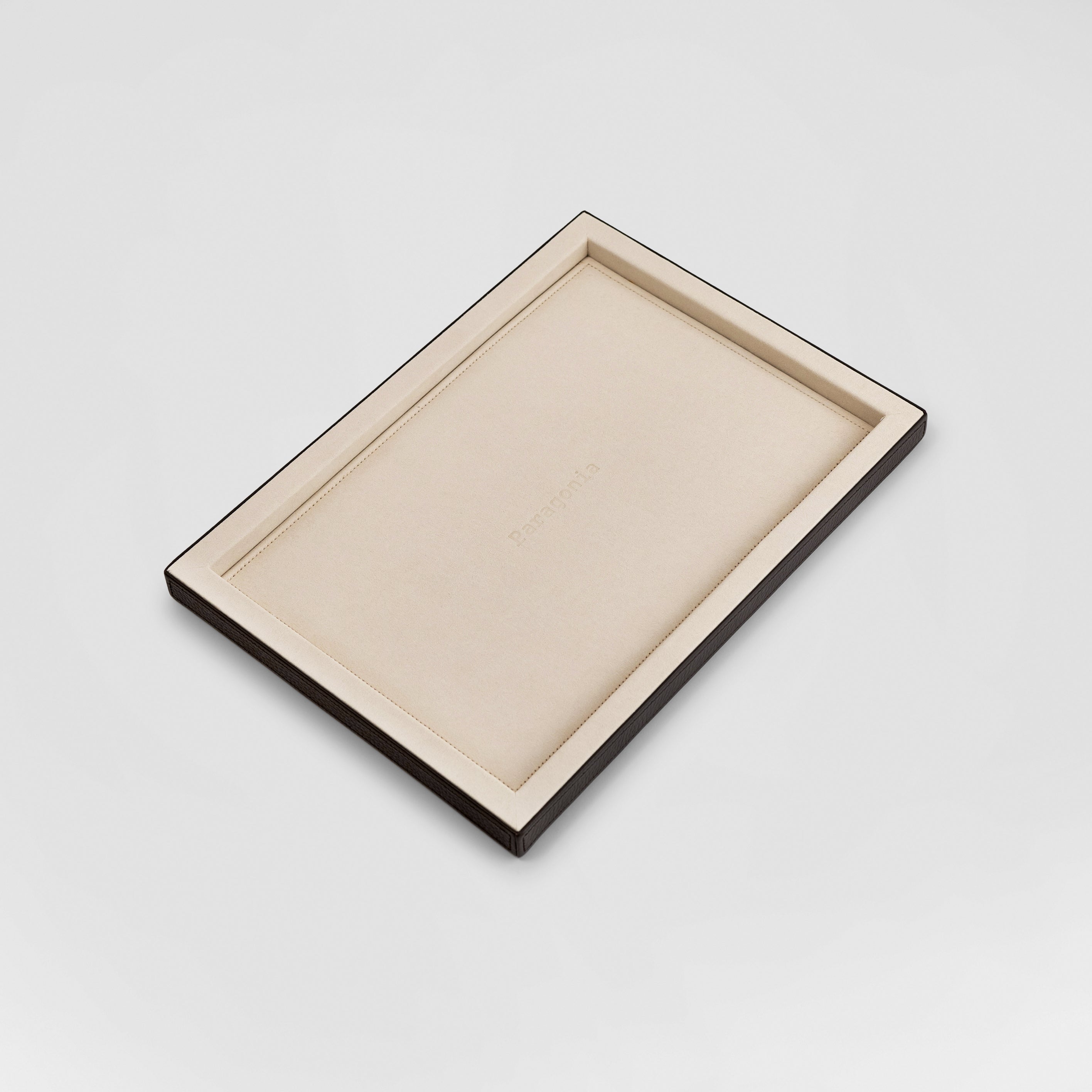 The Presentation Tray is a statement piece for showcasing objects of distinction. Wrapped in rich brown leather, its exterior embodies timeless refinement, while the padded cream Alcantara surface within offers both a soft contrast and a stage of quiet luxury. Designed for presenting timepieces, jewelry, or precious details, the tray transforms display into an experience of elegance and intent. Every line and texture reflects meticulous craftsmanship, ensuring that what rests upon it is elevated with subtle grandeur.