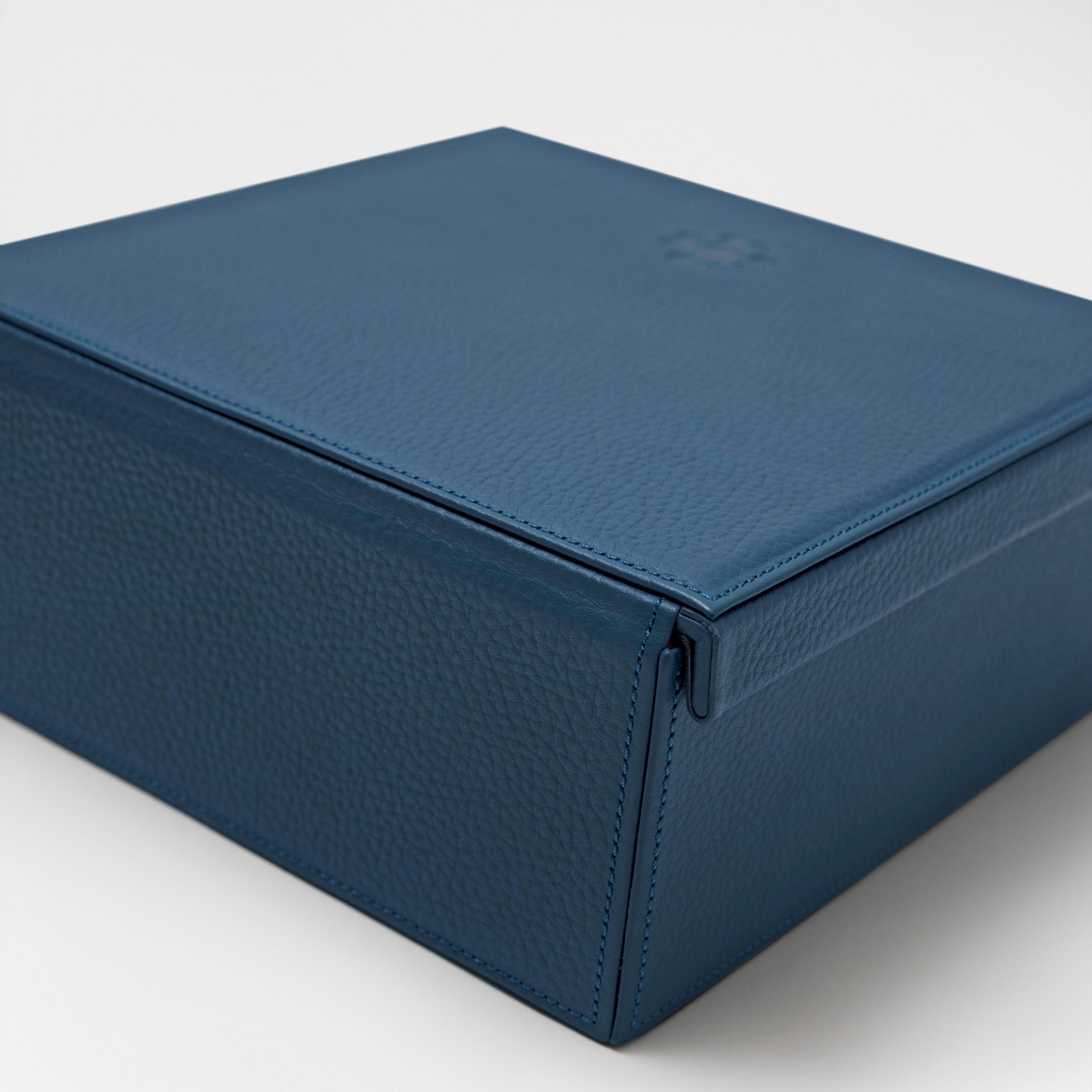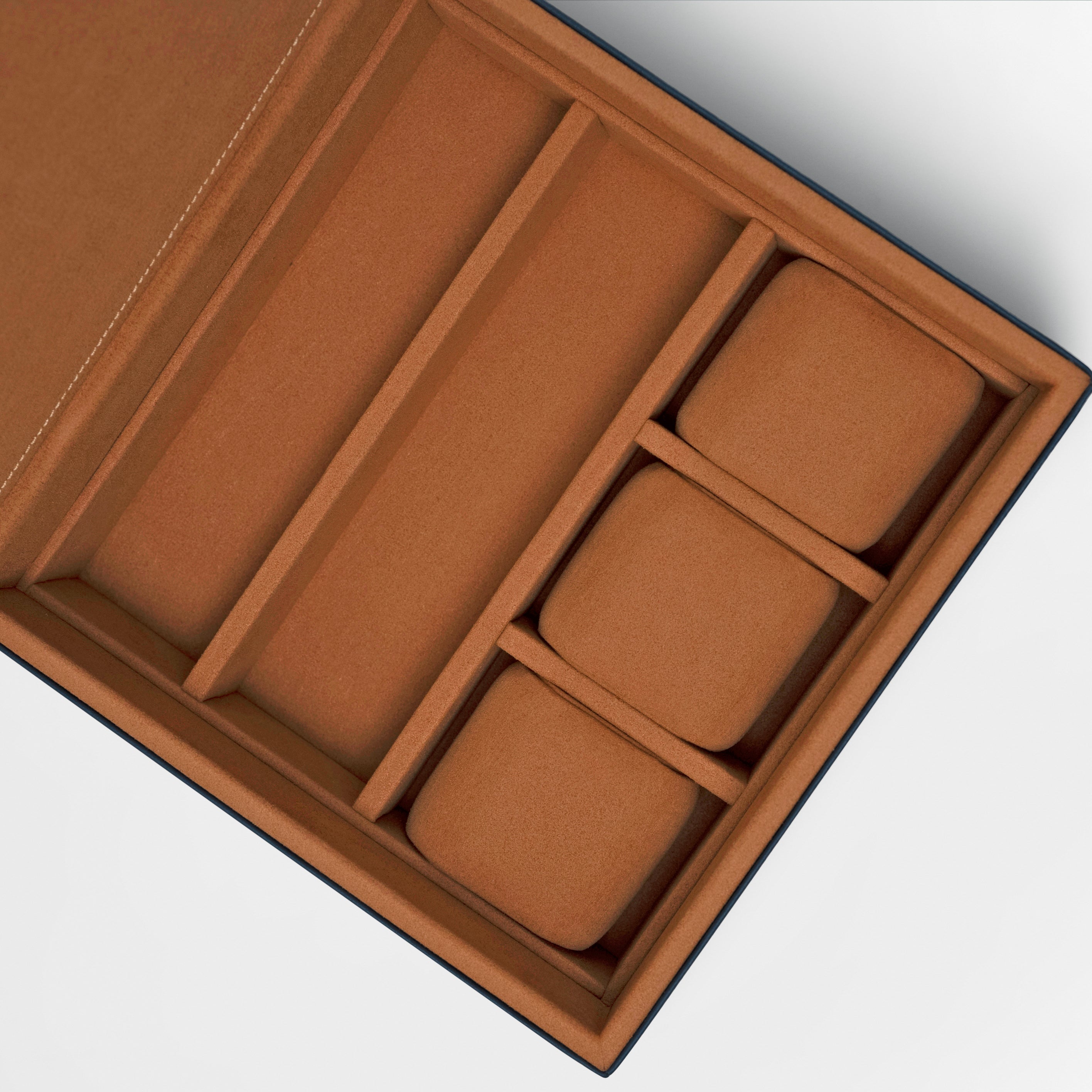 Wrapped in Paragonia’s signature dark blue premium leather, the exterior exudes sophistication and timeless appeal. Inside, a lavish lining of camel-colored alcantara provides a soft, protective embrace for your valuables, ensuring they remain pristine and scratch-free.