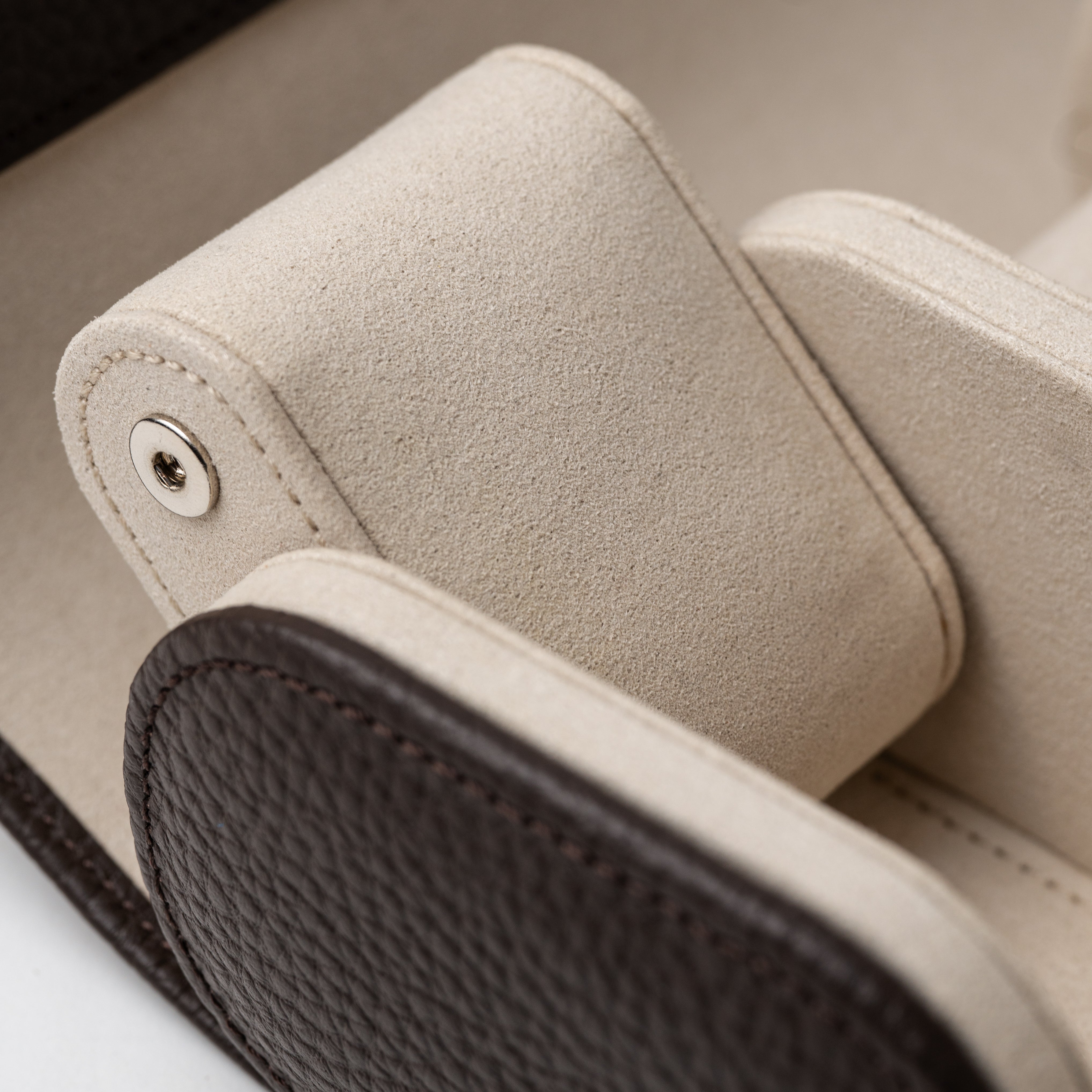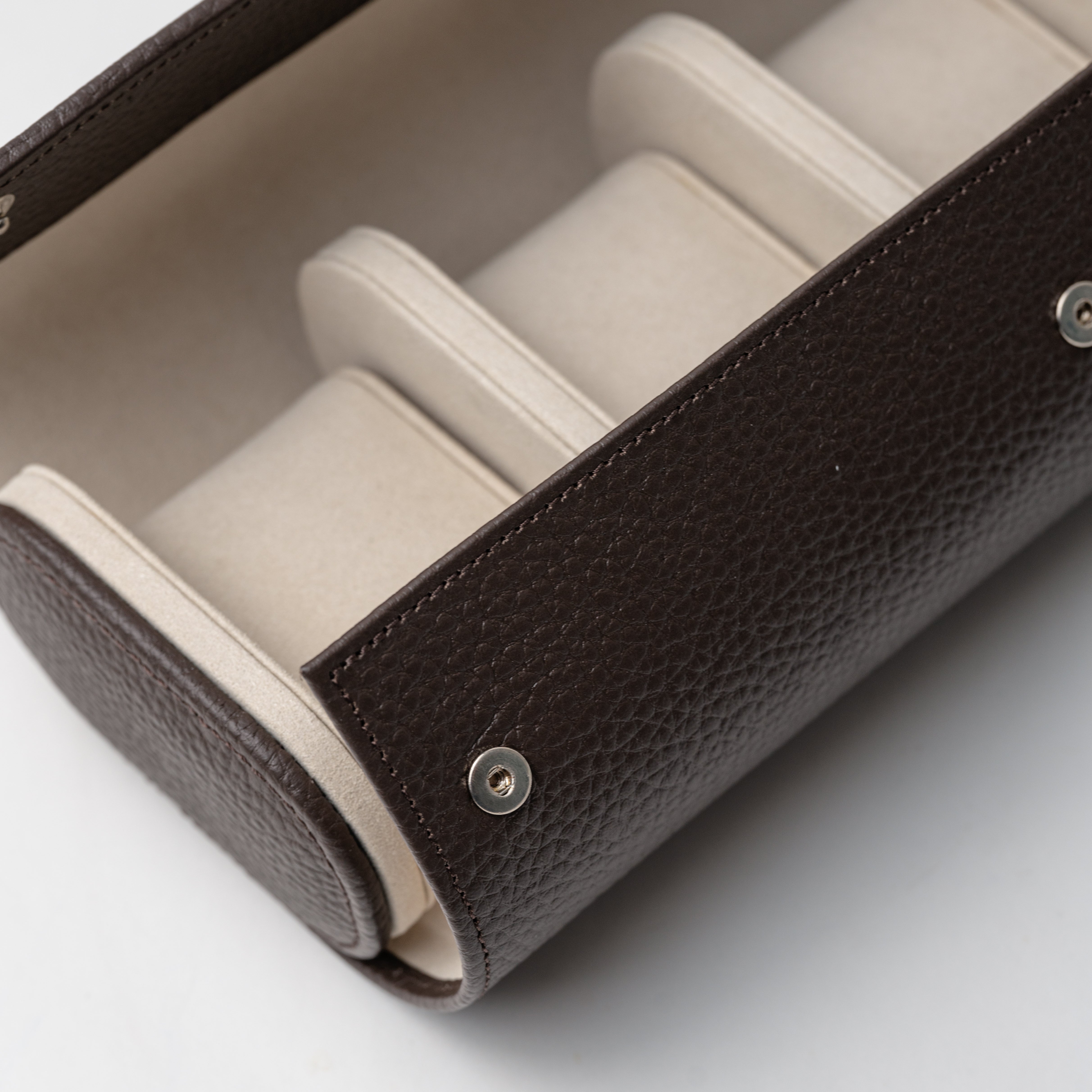 The Watch Roll 4 is a distinguished travel piece, designed to safeguard and showcase up to four timepieces. Its exterior in rich brown leather exudes quiet refinement, while the cream Alcantara interior provides a soft, protective stage that contrasts with warmth and elegance. Each compartment is individually cushioned, ensuring every watch is secured against scratches and wear during travel or storage. Compact in form yet commanding in presence, the Watch Roll 4 unites functionality with craftsmanship, transforming the simple act of carrying watches into an experience of timeless sophistication.